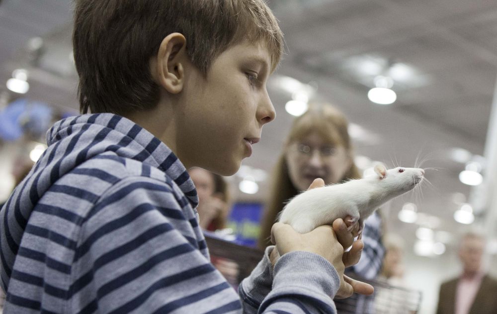 2014年4月18日,在加拿大多伦多,一个男孩和一只小白鼠玩耍。(新华社发)