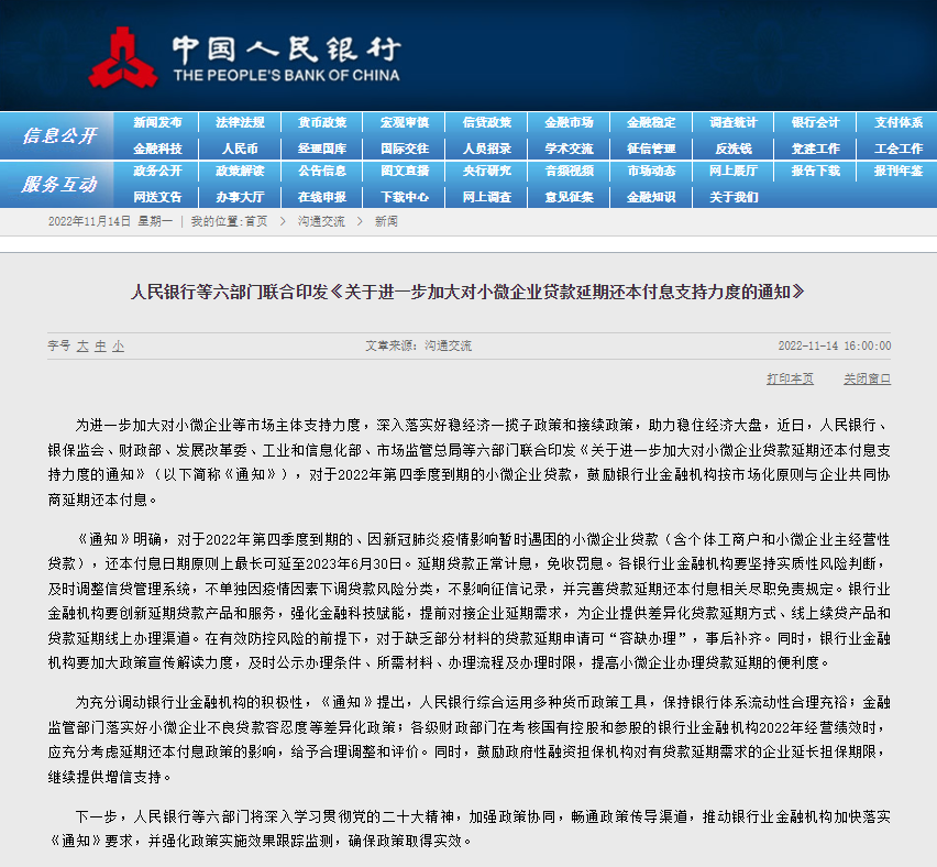为进一步加大对小微企业等市场主体支持力度,深入落实好稳经济一揽子政策和接续政策,助力稳住经济大盘,近日,人民银行、银保监会、财政部、发展改革委、工业和信息化部、市场监管总局等六部门联合印发《关于进一步加大对小微企业贷款延期还本付息支持力度的通知》(以下简称《通知》),对于2022年第四季度到期的小微企业贷款,鼓励银行业金融机构按市场化原则与企业共同协商延期还本付息。