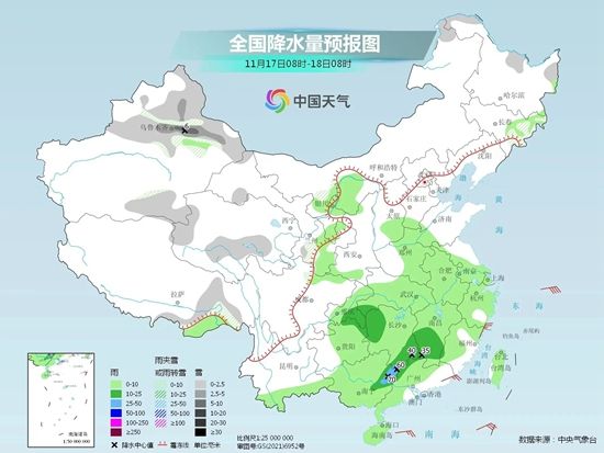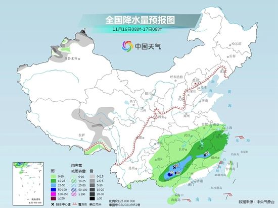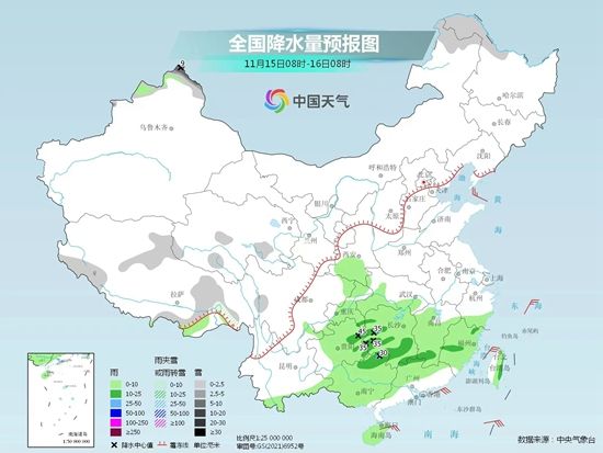 明天将是降雨最强的一天,新疆北部、西藏北部和东部、青海南部等地部分地区有小到中雪,其中,新疆北疆北部和伊犁河谷局地有大雪。江淮西部、江南中东部和西南部、华南西部等地部分地区有中到大雨,其中,广西东北部等地局地有暴雨。