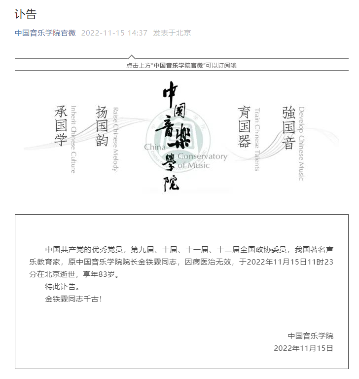 中国共产党的优秀党员,第九届、十届、十一届、十二届全国政协委员,我国著名声乐教育家,原中国音乐学院院长金铁霖同志,因病医治无效,于2022年11月15日11时23分在北京逝世,享年83岁。