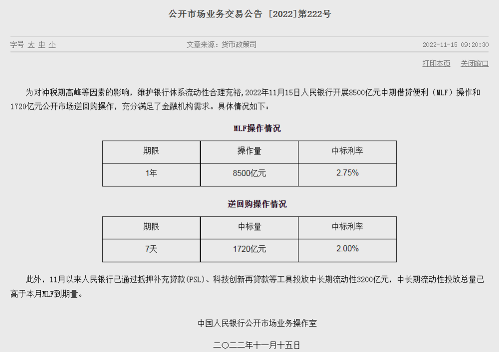 为对冲税期高峰等因素的影响,维护银行体系流动性合理充裕,11月15日中国人民银行开展8500亿元中期借贷便利(MLF)操作和1720亿元公开市场逆回购操作,中标利率均与前次持平。