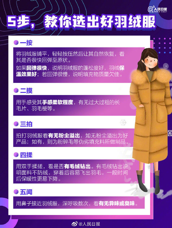 11月17日起,新一轮冷空气即将“发货”。又要降温了,你的羽绒服准备好了吗?今年,羽绒服有了新国标,吊牌上的“含绒量”变成“绒子含量”,这个重要变化你get到了吗?选购羽绒服时,充绒量、蓬松度又该如何考量?今冬羽绒服选购指南,请查收!