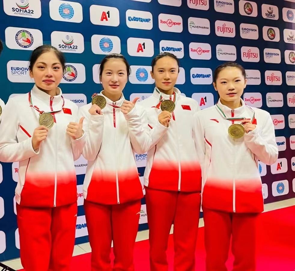 当地时间18日晚,在保加利亚索非亚举办的2022年蹦床世锦赛中,由曹云珠、朱雪莹、胡译乘和范心怡组成的中国队,收获女子网上团体赛金牌,英国队和日本队分获银牌和铜牌。