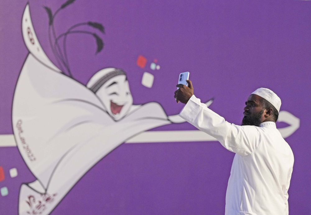 11月18日,游人在世界杯吉祥物背景墙前自拍。新华社记者 陈诚 摄