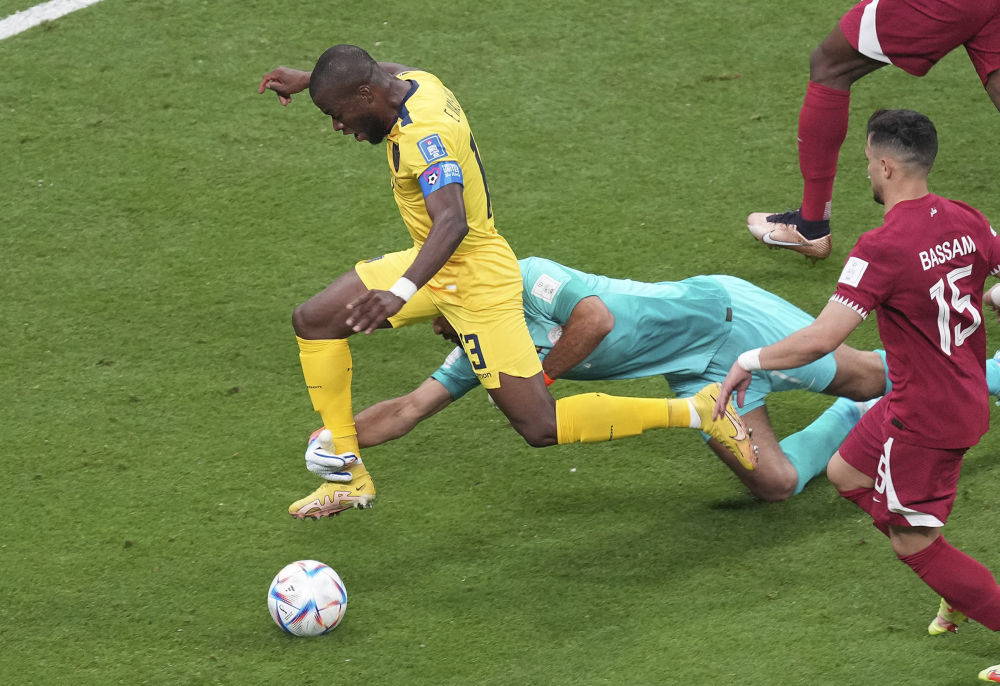 卡塔尔队守门员萨德·西卜(下)在比赛中犯规防守厄瓜多尔队球员恩纳·瓦伦西亚,随后被主裁判出示黄牌警告,并判给厄瓜多尔队一个点球。这是本届世界杯第一张黄牌。新华社记者 陈诚 摄