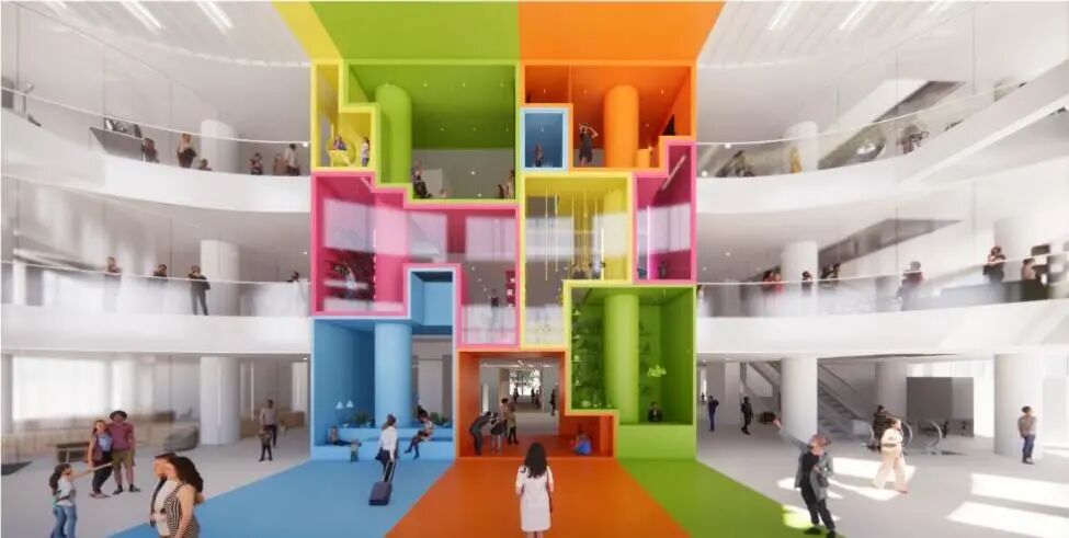 大厦改造设计由荷兰著名建筑设计事务所MVRDV倾情奉献,赋予大厦丰富的功能性和出色的创新性,每处设计都倾注了爱的温暖,缤纷彩色外立面、裙楼屋顶花园、全新室内区域规划和动线元素,都将为我们带来一个充满活力、温暖美好的妇儿主题标杆建筑和妇儿公益服务阵地。