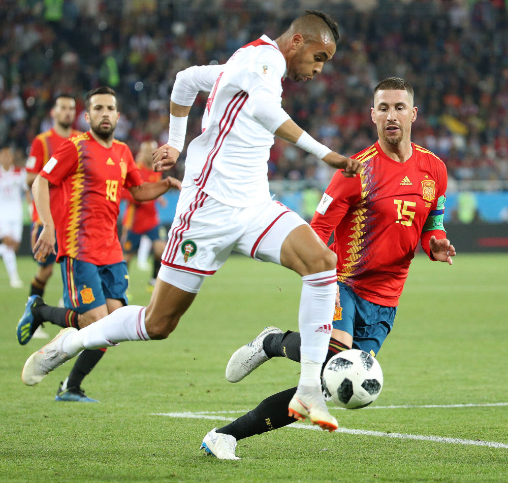 ↓2018年俄罗斯世界杯小组赛摩洛哥队以2比2逼平西班牙队。新华社记者 李明 摄