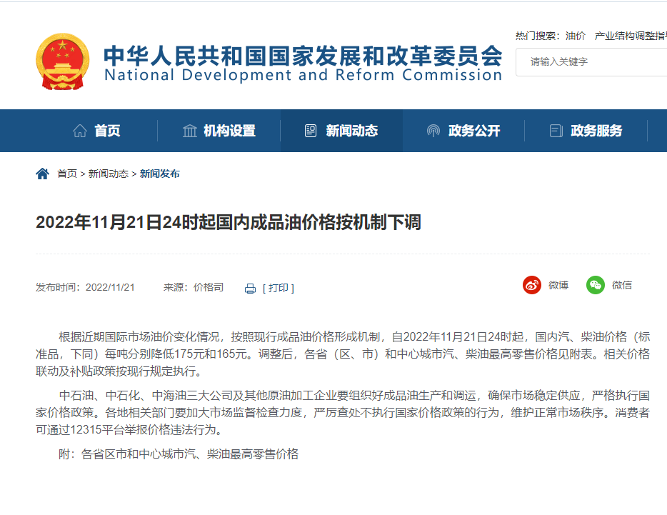根据近期国际市场油价变化情况,按照现行成品油价格形成机制,自2022年11月21日24时起,国内汽、柴油价格(标准品,下同)每吨分别降低175元和165元。调整后,各省(区、市)和中心城市汽、柴油最高零售价格见附表。相关价格联动及补贴政策按现行规定执行。