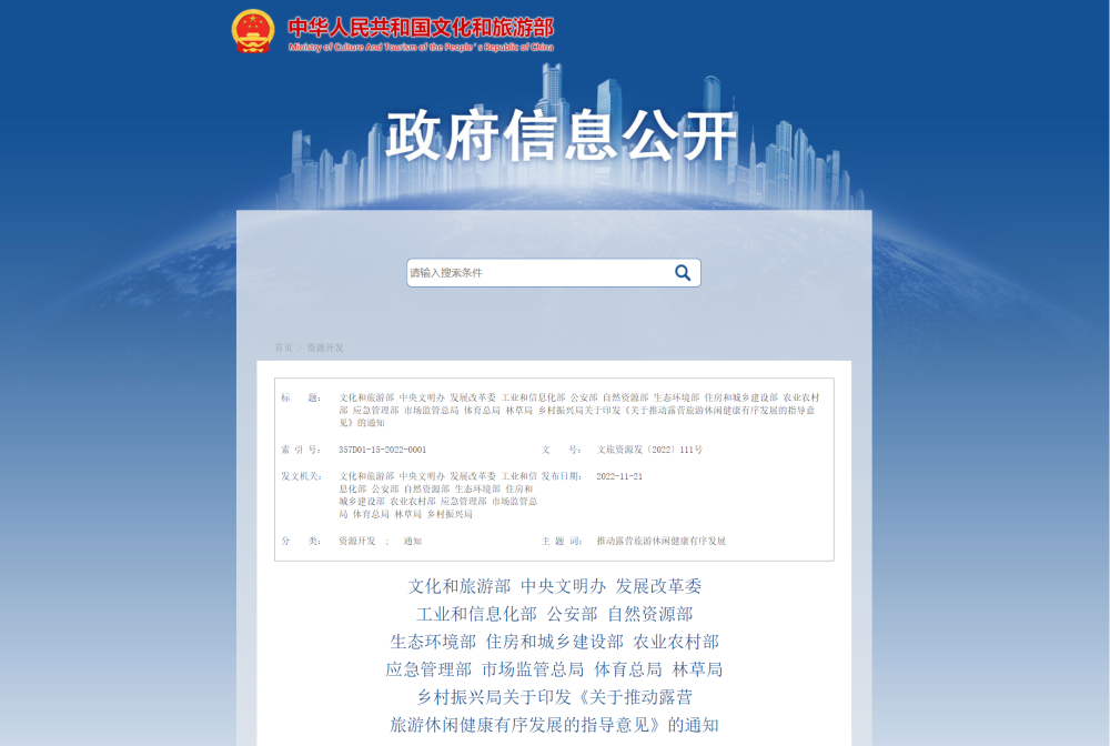 据文旅部网站21日消息,文化和旅游部、中央文明办、发展改革委、工业和信息化部、公安部、自然资源部、生态环境部、住房和城乡建设部、农业农村部、应急管理部、市场监管总局、体育总局、林草局、乡村振兴局近日印发《关于推动露营旅游休闲健康有序发展的指导意见》。
