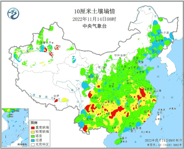 而从中央气象台发布的10厘米土壤墒情监测图也可以看到,与11月14日相比,今天南方重度缺墒和轻度缺墒的面积也大大缩减。