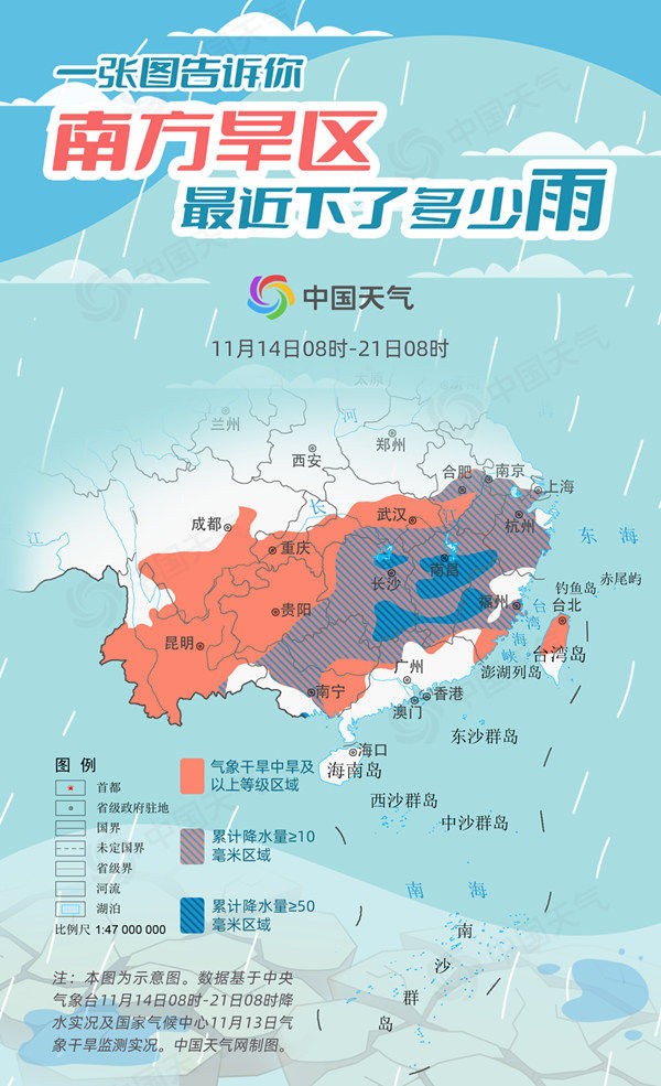 久旱逢甘霖!上周,一直持续气象干旱的江南、华南等地终于接连迎来了两轮降水过程。在雨水的滋润下,当地气象干旱得到了明显缓解,中央气象台也在11月16日解除了连续发布90天的气象干旱预警。那么,最近南方下了多少雨?