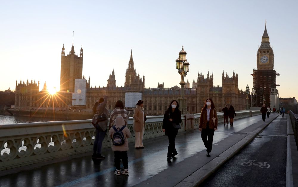 2022年1月13日,人们走在英国伦敦的威斯敏斯特桥上。(新华社记者李颖摄)