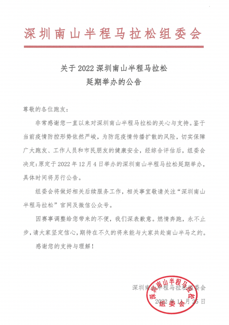 原定于12月4日举办的2022深圳南山半程马拉松延期举办,具体时间将另行公告