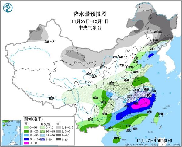 此次寒潮天气将为南方地区带来大范围雨雪天气。预计27日至29日,江汉、江淮和江南部分地区有中到大雨,其中江西中北部、浙江西南部、福建北部等地有暴雨,局地大暴雨,并伴有雷电;29日夜间至12月1日,四川东北部、重庆东北部、湖北、贵州及江南北部等地的部分地区将先后出现雨转雨夹雪或雪。30日至12月1日,贵州、湖南西部和北部、江西北部等地有冻雨。