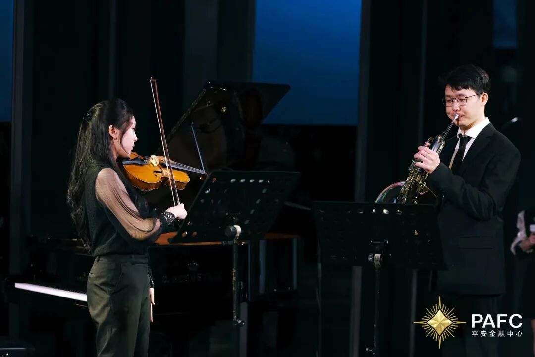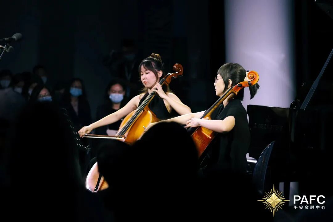 平安金融中心的顶层随即被温暖的大提琴声包围,作品改编自动漫配乐,陈希和罗卓雯的大提琴重奏演绎版本为作品注入了厚重的情感,像是两位多年未见的故友重逢,互相用音符倾诉思念,互诉当年美好回忆,赢得观众阵阵掌声。