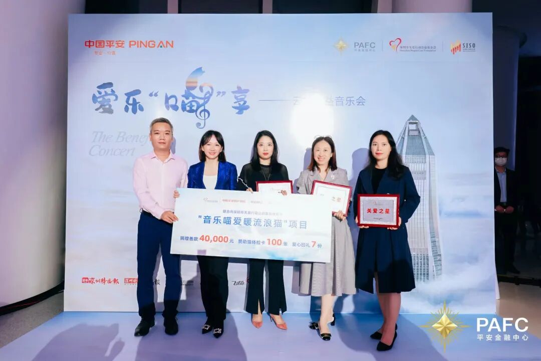 音乐会现场,平安产险深圳分公司、平安银行深圳分行、平安养老险深圳分公司、平安健康互联网股份有限公司等爱心企业联合向深圳市关爱行动公益基金会捐赠了4万元的善款、100份的猫体检卡和7份企业员工职场健康爱心回馈大礼包。深圳市关爱行动公益基金会副秘书长魏平为爱心企业颁发“关爱之星”牌匾、“护喵使者”证书,对他们关爱流浪猫的爱心举动表示谢意。此外,现场多位爱心人士捐出善款,为“音乐喵爱暖流浪猫”公益项目助力。