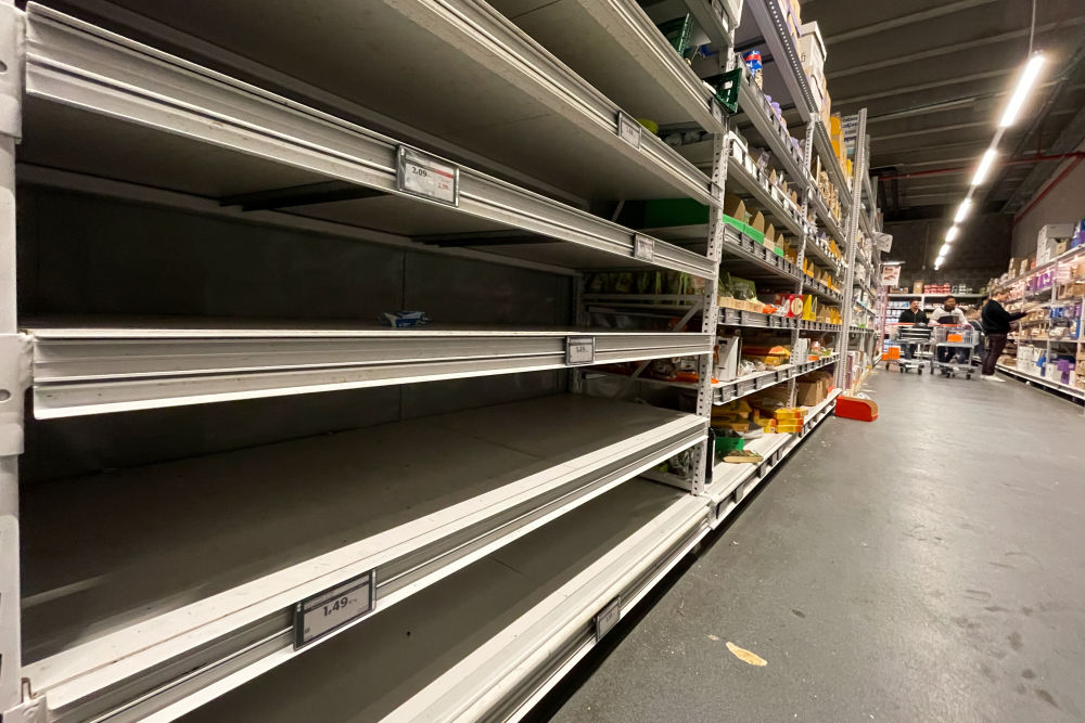 10月31日,比利时布鲁塞尔一家超市售卖平价鸡蛋的货架空空如也。(新华社记者郑焕松摄)