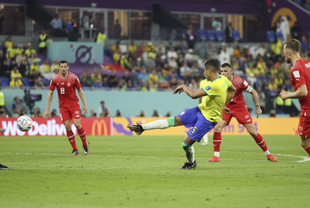 11月28日,巴西队球员卡塞米罗(左二)在比赛中射门得分。新华社记者李明摄