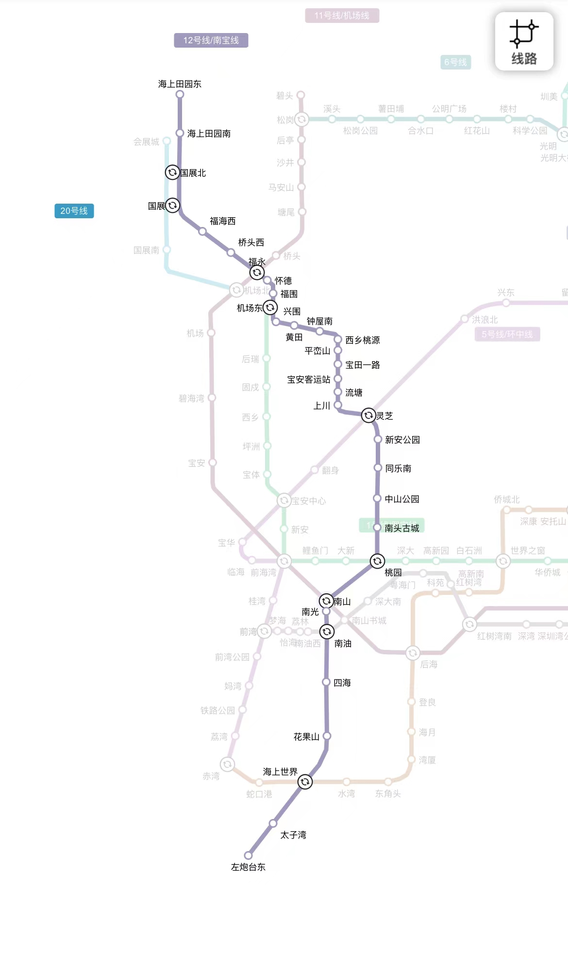 深圳地铁12号线于11月28日正式开通。全线长约40.54km,采用全自动运行模式,设计最高运行速度80公里/小时,设车站33座。其中,换乘车站多达20座(含远期规划),开通后可以实现与1、2、5、9、11、20号线的换乘,是名副其实的换乘大王。