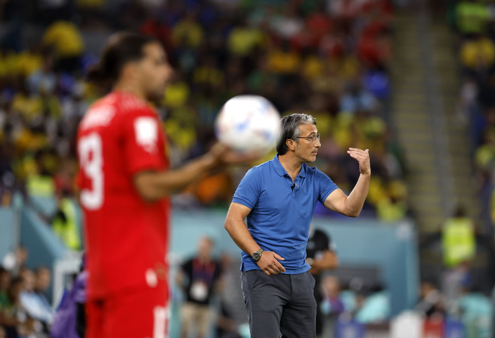 当地时间11月28日,瑞士队主教练穆拉特·亚金(右)在比赛场边指挥。新华社记者 王丽莉 摄