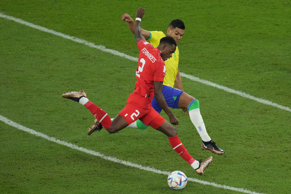 当地时间11月28日,巴西队球员卡塞米罗(右)在比赛中防守瑞士队球员费尔南德斯。新华社记者 郑焕松 摄