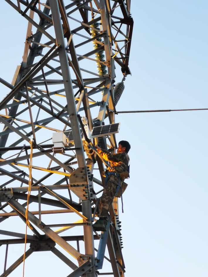 湖南邵阳城步县,工作人员正在将本贸科技研发的低功耗电力智能巡检系统安装在高压输电塔上进行实地使用测试。