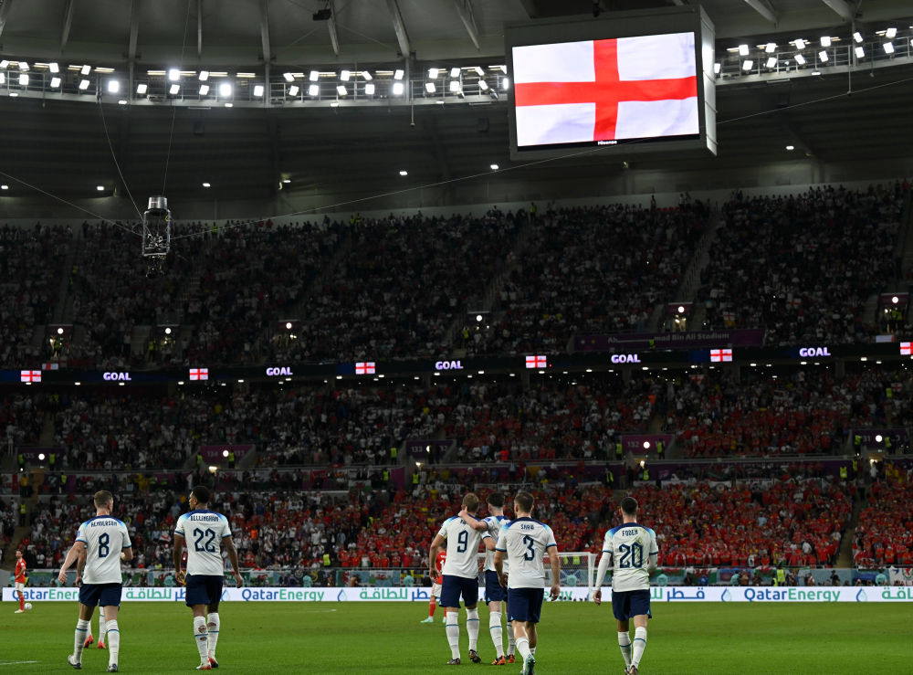 11月29日,英格兰队球员在比赛中庆祝进球。新华社记者 肖艺九 摄