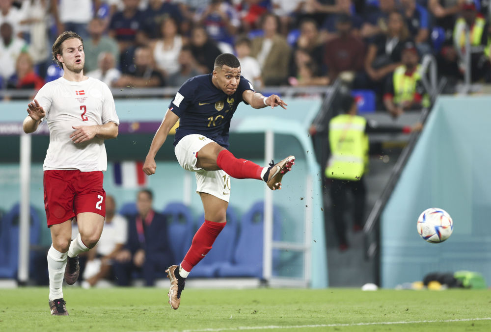 11月26日,法国队以2比1战胜丹麦队,图为法国队球员姆巴佩(右)在比赛中进攻。新华社记者兰红光摄