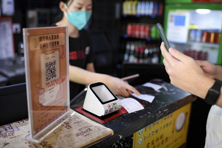11月11日,市民在银川市新华百货一家餐饮店用餐后,使用消费券支付。新华社记者冯开华 摄