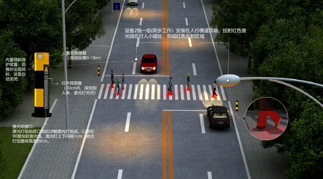 当行人即将进入斑马线的瞬间,该设备探测到行人并投射28条红色激光线到行人小腿处,形成“红靴子”投影,这样即使机动车驾驶员在远处也能得到警示,做到及时避让前方行人。