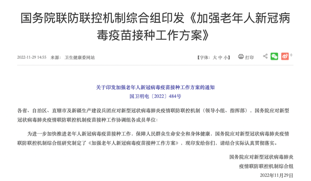 关于印发加强老年人新冠病毒疫苗接种工作方案的通知(图源:中国政府网)