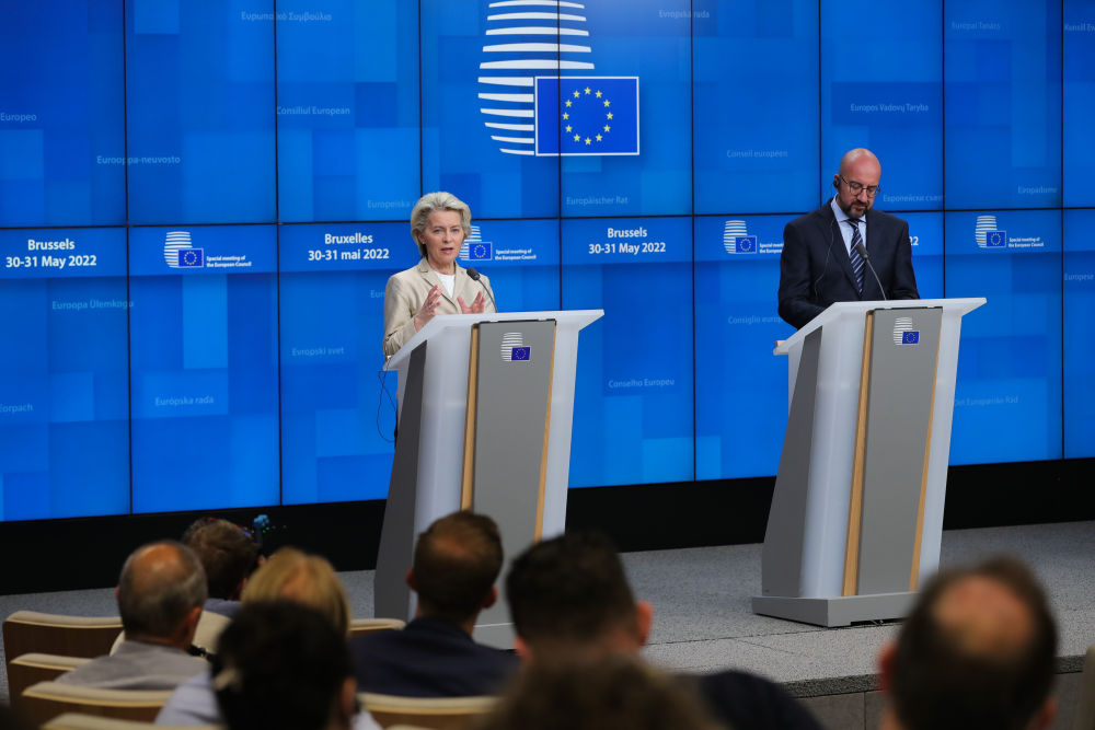 5月31日,在比利时布鲁塞尔,欧盟委员会主席冯德莱恩(左)和欧洲理事会主席米歇尔在欧盟特别峰会后举行新闻发布会。新华社记者郑焕松摄