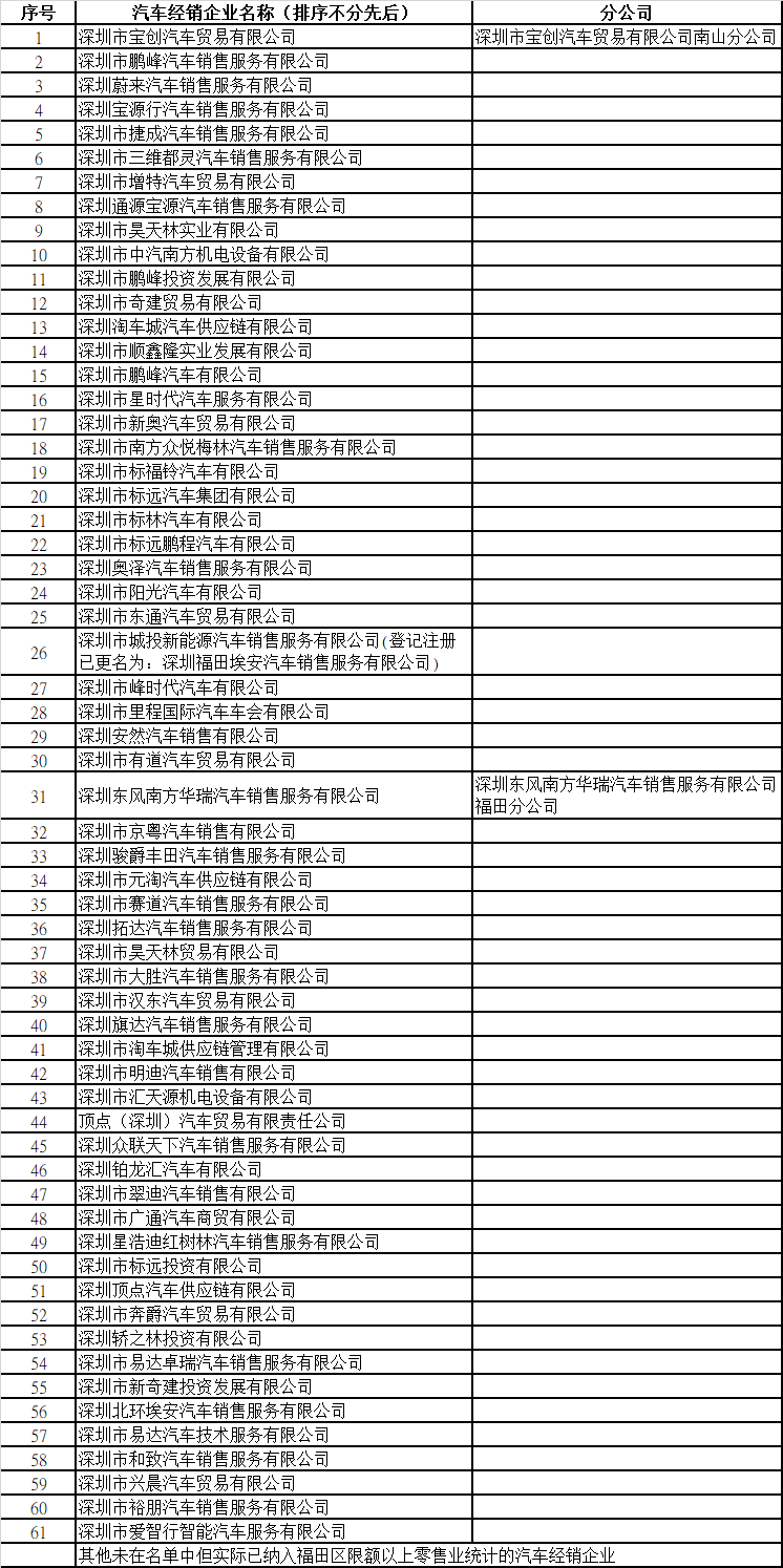 备注:其他未在名单上但实际已纳入福田区限额以上零售业统计的汽车经销企业,若有疑问请联系深圳市福田区工业和信息化局(商务局)。