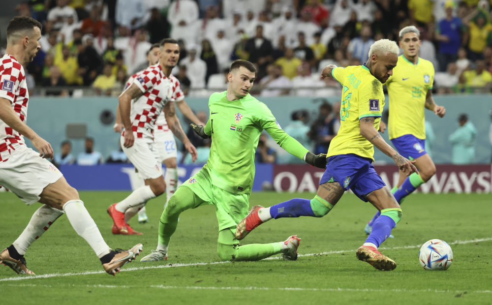 12月9日,巴西队球员内马尔(右二)在比赛中突破克罗地亚队守门员利瓦科维奇(右三)的防守后射门得分。新华社记者兰红光摄