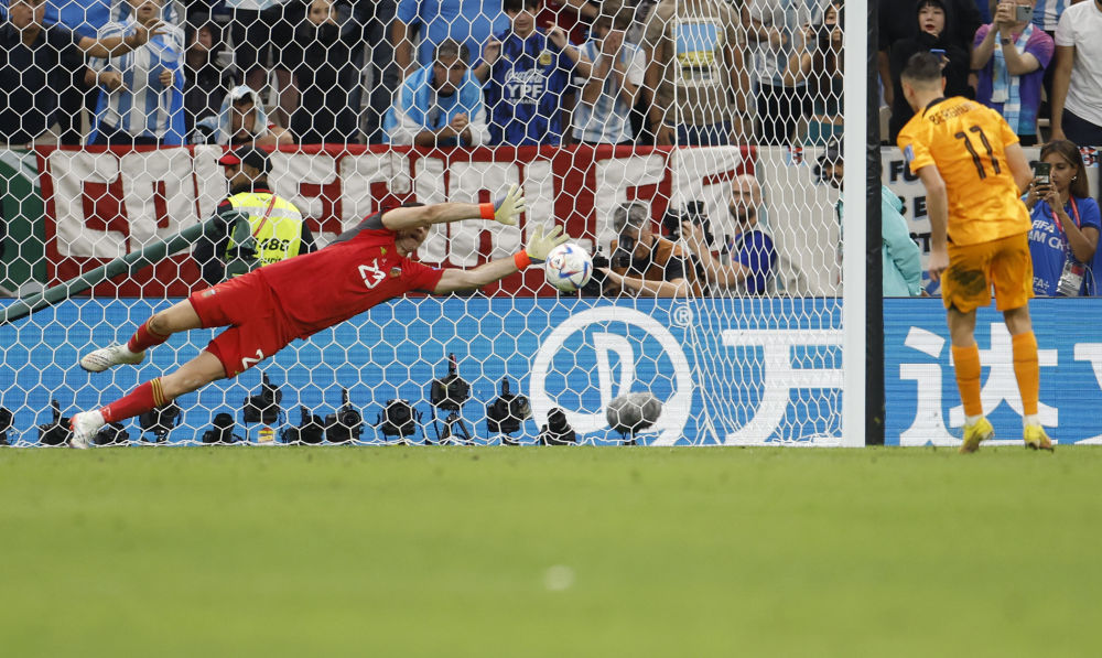 12月9日,阿根廷队守门员马丁内斯(左)在点球大战中扑出荷兰队球员史蒂文·博古伊斯的射门。新华社记者王丽莉摄