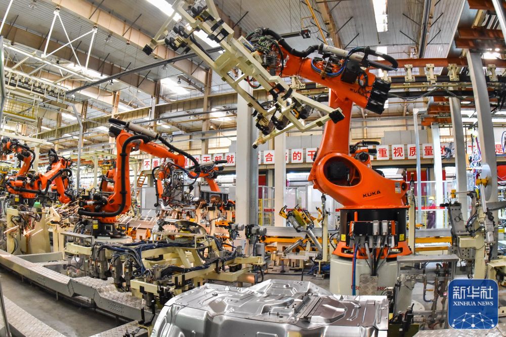 10月27日,机械手在山东省青州市一家汽车制造企业车间内装配生产。新华社发(王继林摄)