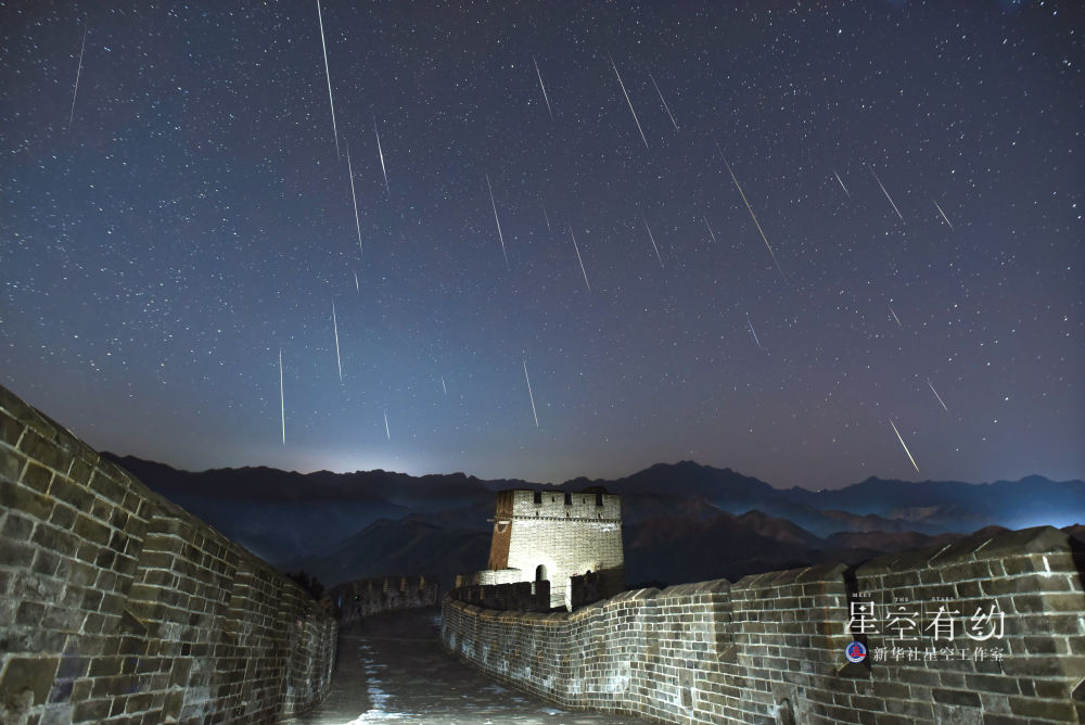 中国天文学会会员、天津市天文学会理事杨婧2021年12月14日在天津市蓟州区黄崖关长城拍摄的双子座流星雨(多张叠加)。(本人供图)