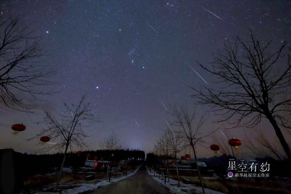 北京市海淀区中关村第二小学天文教师朱戈雅2015年12月14日在北京房山花台风景区拍摄的双子座流星雨(多张叠加)。(本人供图)