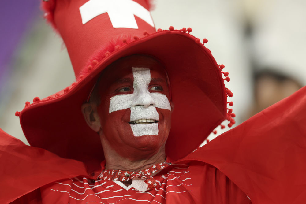 ↑12月6日,瑞士队球迷在八分之一决赛对阵葡萄牙队的比赛前。新华社记者 韩岩 摄