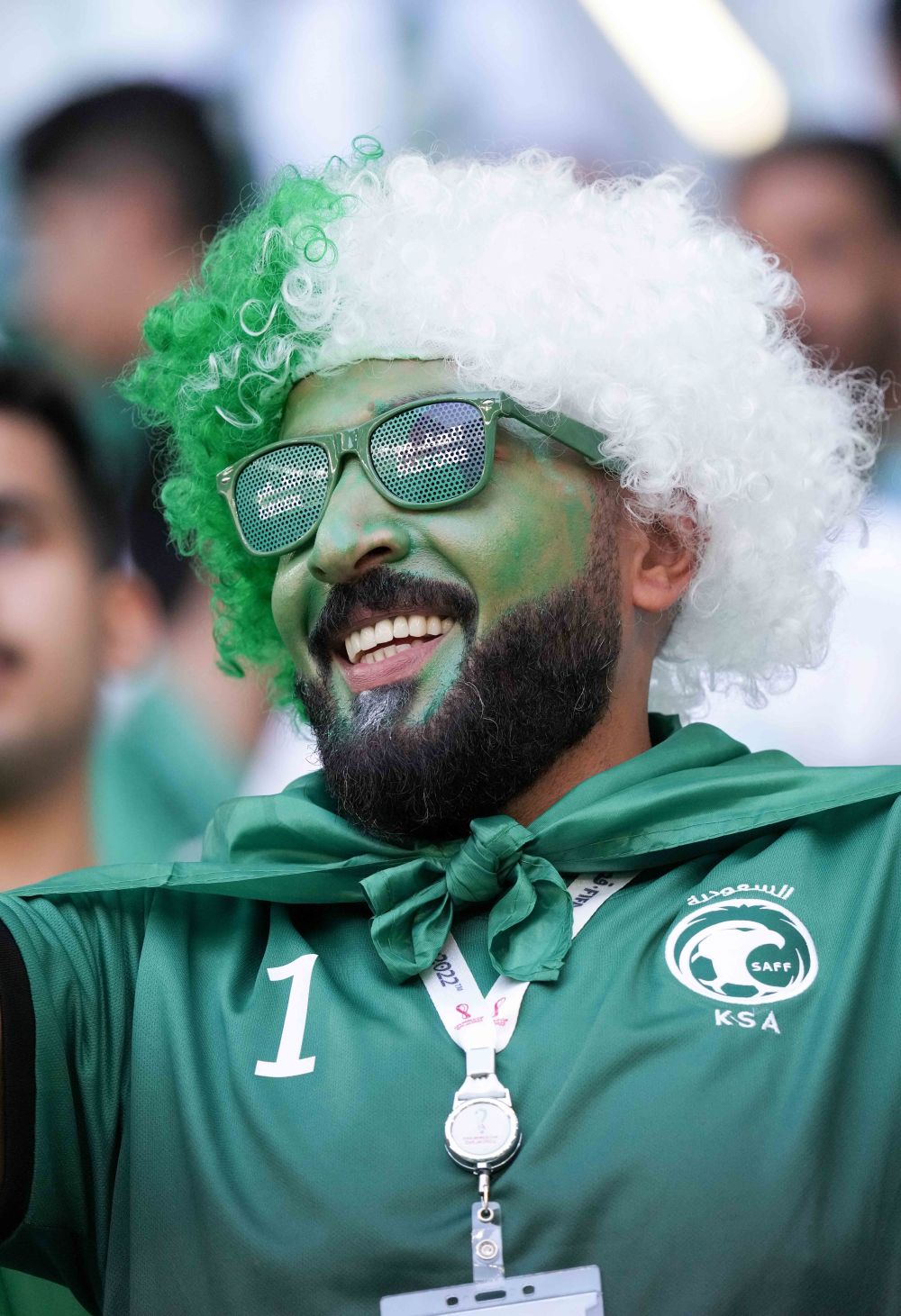 ↑11月26日,沙特阿拉伯队球迷在小组赛对阵波兰队的比赛中。新华社记者 李钢 摄