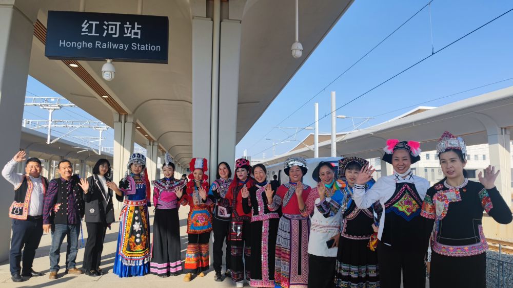 身着少数民族服装的乘客在红河站合影留念。(受访对象供图)