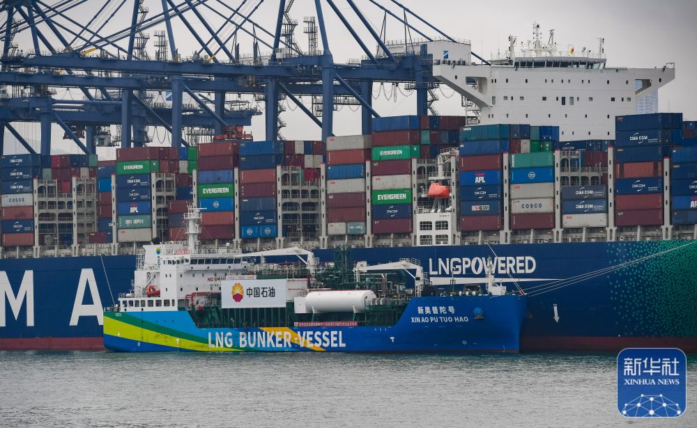 11月22日,在深圳盐田港,C型罐式LNG加注船“新奥普陀号”为法国达飞集团的双燃料集装箱船“达飞·索邦”号加注LNG燃料。新华社记者 毛思倩 摄