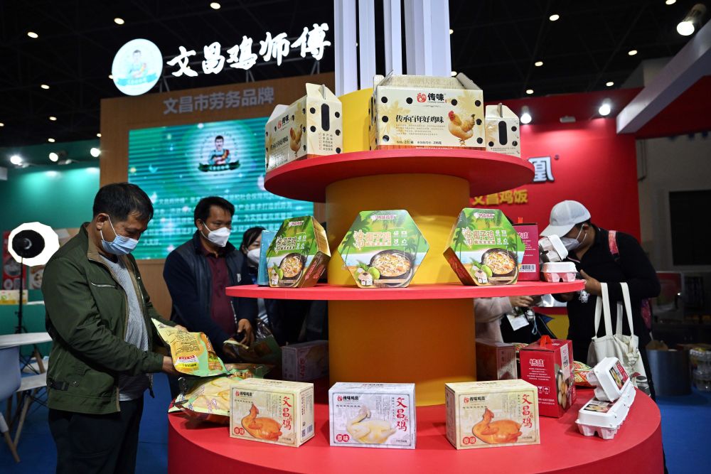这是在2022冬交会海南文昌展台展示的文昌鸡品牌相关产品。新华社记者 郭程 摄
