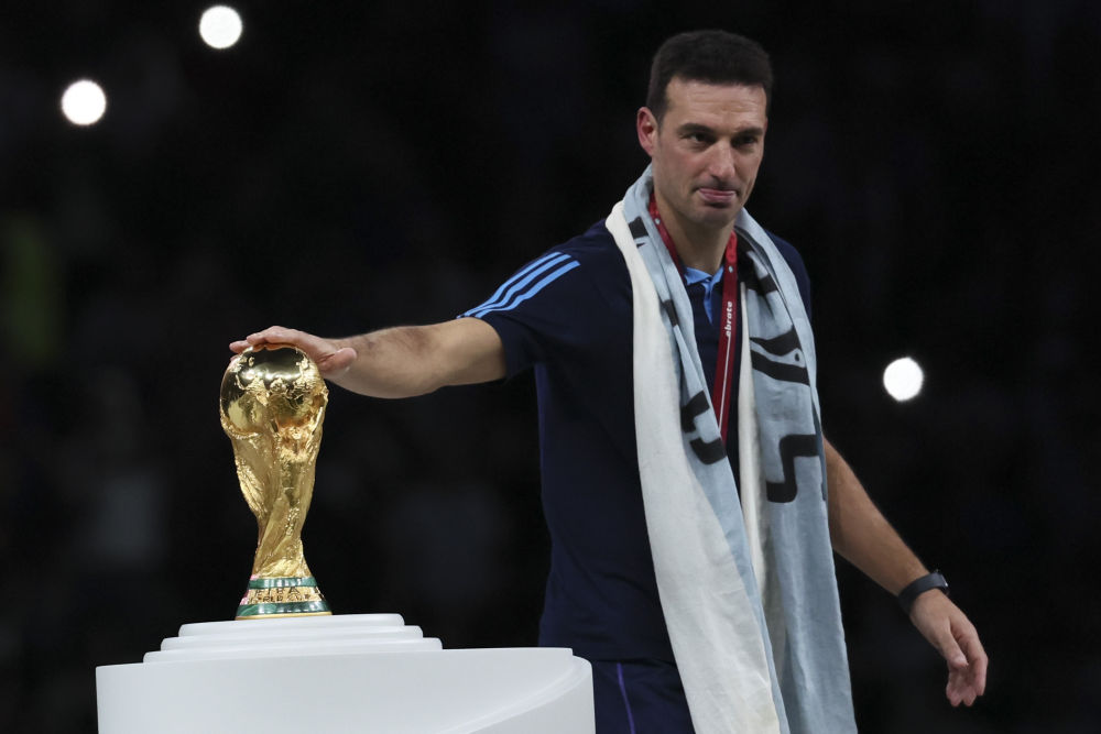2022年12月18日,阿根廷队主教练斯卡洛尼在颁奖仪式上抚摸大力神杯。新华社记者 兰红光 摄