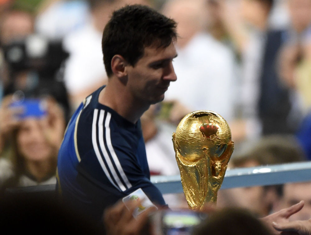 2014年7月13日,阿根廷队球员梅西在巴西世界杯颁奖仪式前从大力神杯前走过。新华社记者吕小炜摄