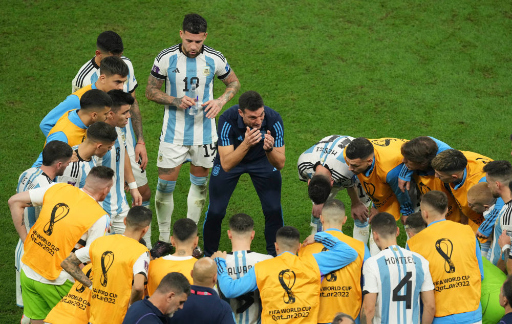 2022年12月18日,阿根廷队主教练斯卡洛尼(上中)在加时赛开始前指导球员。新华社记者 潘昱龙 摄