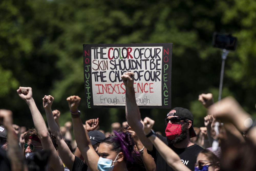 2020年5月乔治·弗洛伊德事件发生后,全美各地大规模反种族歧视抗议示威活动持续不断。图为同年6月6日,示威者手举标语“肤色不该成为我们死去的原因”在芝加哥参加游行示威。新华社发(克里斯·迪尔茨摄)