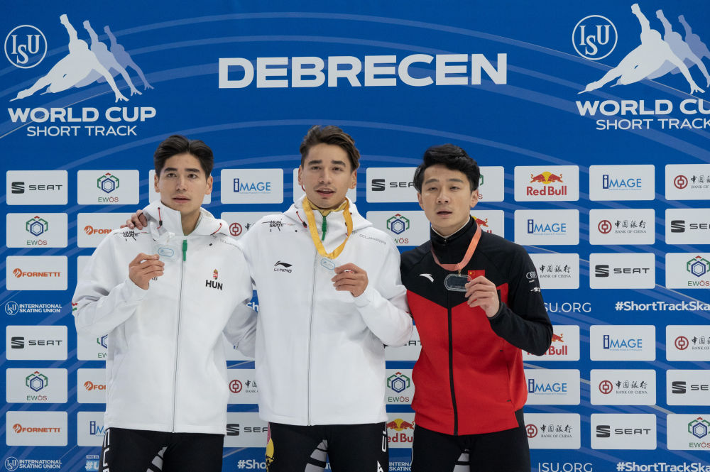 2021年11月20日,2021-2022赛季国际滑联短道速滑世界杯匈牙利站,冠军匈牙利选手刘少林(中)、亚军刘少昂(左)和季军中国选手任子威在男子500米颁奖仪式上。新华社发(弗尔季·奥蒂洛 摄)