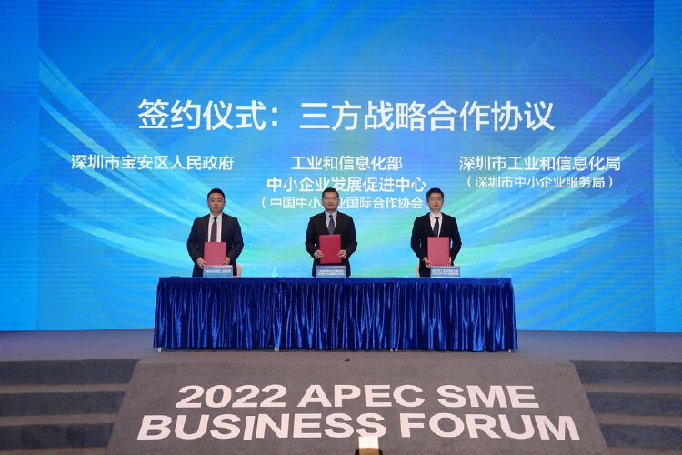 2022年亚太经合组织(APEC)中小企业工商论坛正在深圳市宝安区以线上线下结合的方式举行。在12月21日进行的议程上,工业和信息化部中小企业发展促进中心(中国中小企业国际合作协会)、深圳市工业和信息化局(深圳市中小企业服务局)和宝安区人民政府三方签署了战略合作协议,APEC中小企业工商论坛将长期落户宝安。