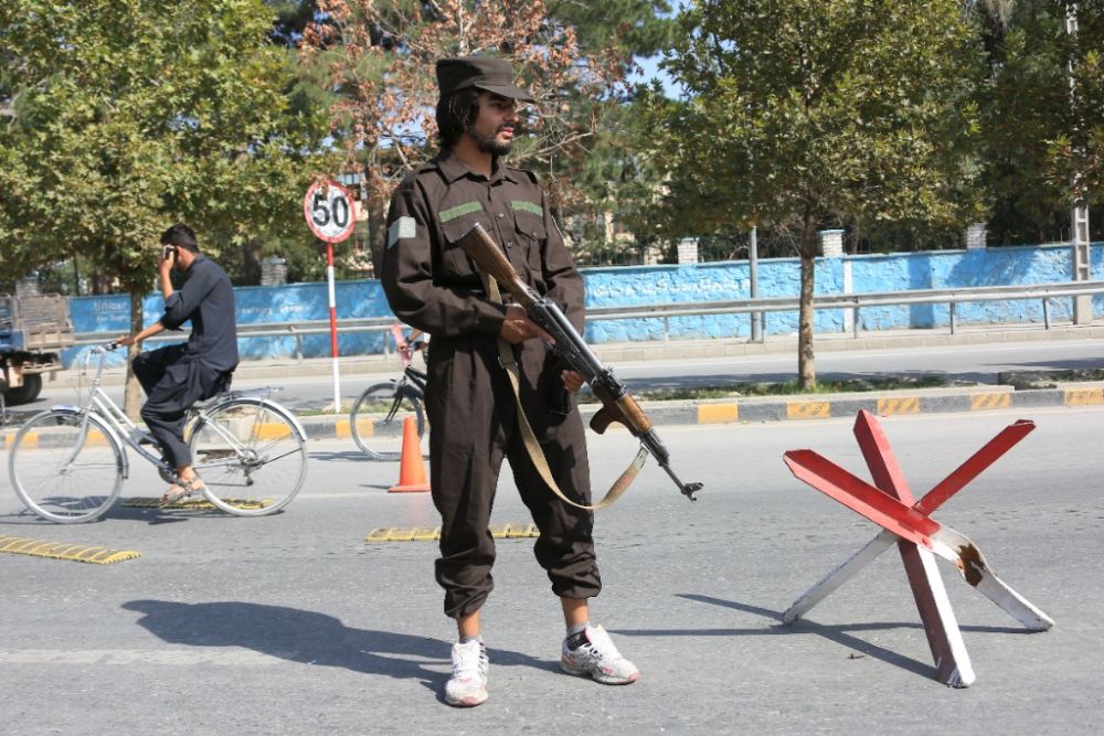 9月5日,阿富汗安全人员在喀布尔爆炸现场附近警戒。新华社发(塞夫拉赫曼·萨菲摄)